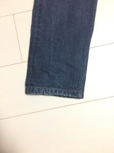 折り返しも太めです。縦筋のような裾の色落ち変化です