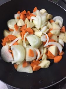 野菜たちを切り、炒めます